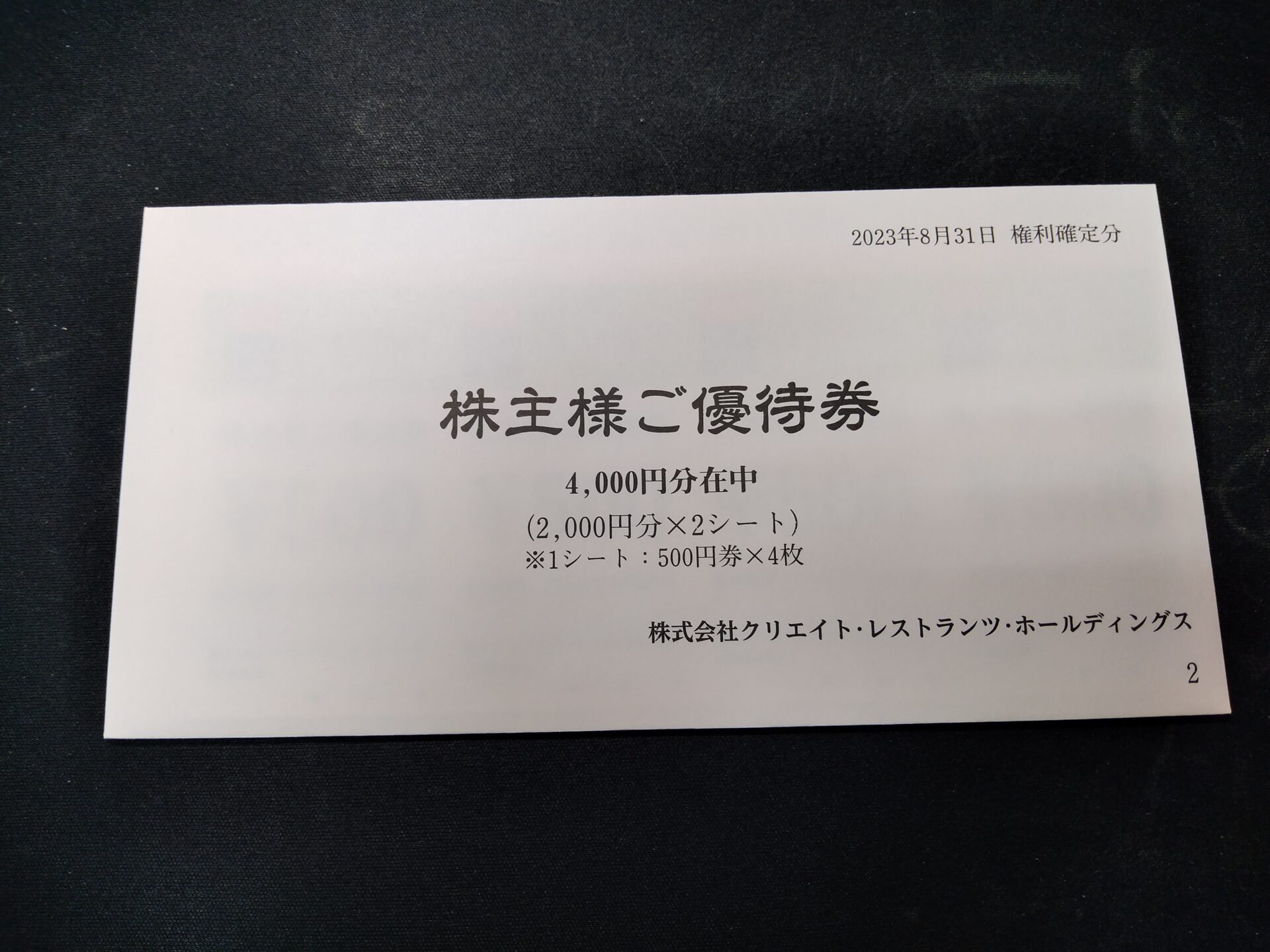 クリエイトレストランツホールディングスより株主優待券到着! by wataridori · 2023年11月13日 よし!吞みに行こう! 近所に4件ぐらいあったのにコロナで3件近く潰れて使い道がないんだよなあ~ またそのうち近所で復活するだろうか? まあ、とりあえずせんきゅー