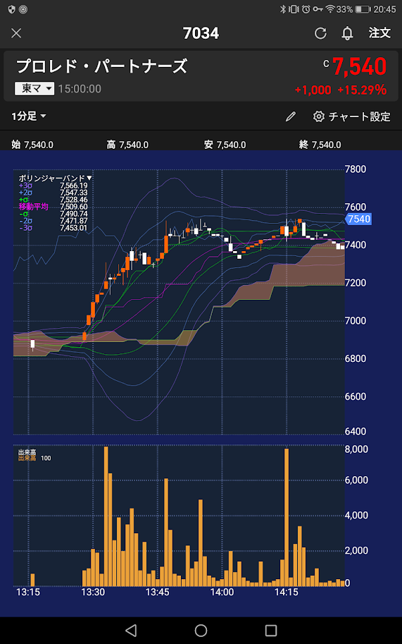 煽りをした仕手がいたのかわからないが13:40前後に8000株成買いで株価を吊り上げ。