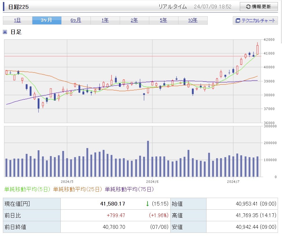9日後場は日経平均株価が、前日比799円47銭高の4万1580円17銭と3日ぶりに大幅反発し、終値ベースでの史上最高値を更新。TOPIX(東証株価指数)が同27.94ポイント高の2895.55ポイントと3日ぶりに反発して取引を終了した。米ナスダック総合指数高を受け、朝方から半導体関連株を中心に買いが先行。株価指数先物に断続的な買いが入ったことから上げ幅を拡大した。