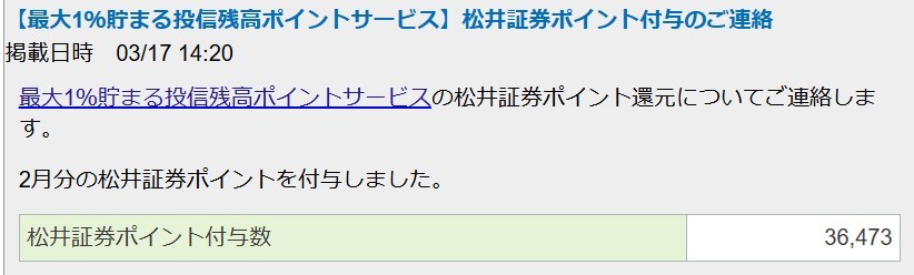 3月分の松井証券「投信残高ポイントサービス」が適用されました。