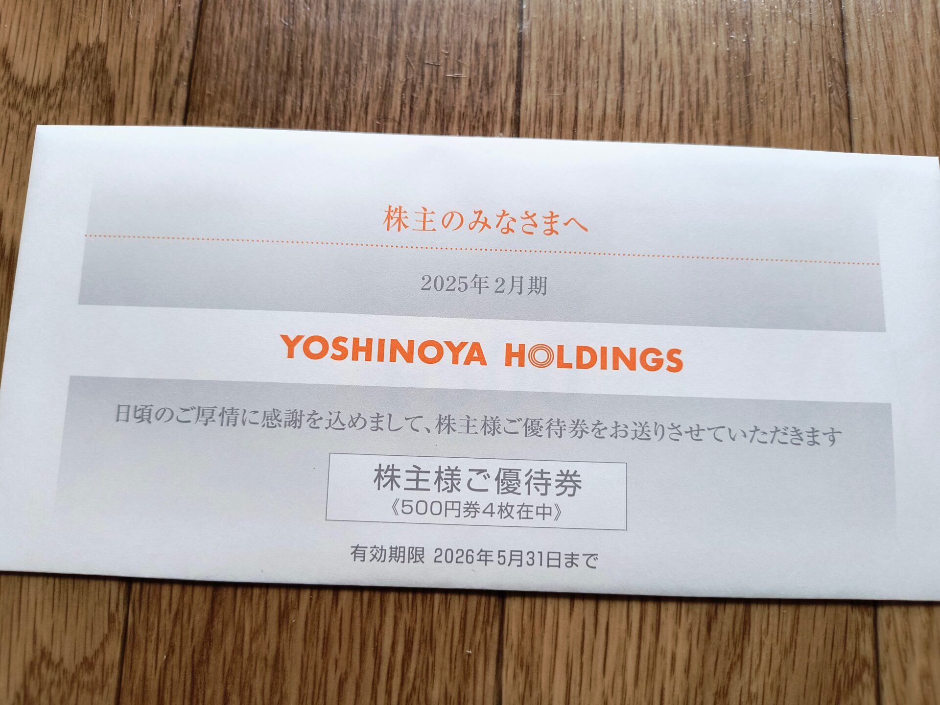 吉野家から株主優待券到着! by wataridori · 2025年5月13日 ついでにインターネットで議決権行使! 食事券はありがてえけど、以前は3000円分だったのに2000円に減額したの元に戻してほしいな。 メニューの値上げしてるんだからそれくらいして欲しいわ。 ま、定番の牛丼を喰うかな。