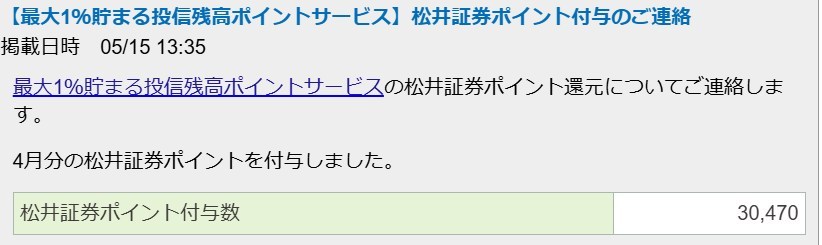 5月分の松井証券「投信残高ポイントサービス」が適用されました。 by wataridori · 2025年5月15日 トランプショックで投信激下がりしたのでポイントも激下がり・・・ ファッキントランプのせいで下がってしまった。 トランプ絶許! 来月は頼むぜ!