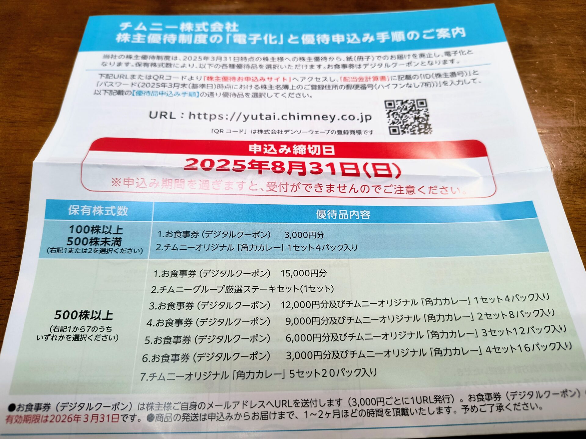 チムニー株主優待到着。 by wataridori · 2025年6月22日 今期から電子化 なんか500円ごとにURLが変わる?らしくダルそうなイメージ。 この手の電子化株主優待は各社共通のアプリとか作ってくれないかなあ。 めんどくさいんですけど・・・・・・ ま、しっかり使い切りましょ。