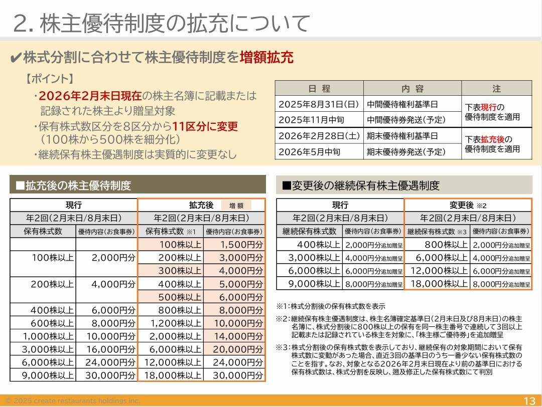 クリエイト・レストランツが株式分割! by wataridori · 2025年7月15日 1株を2株にして優待拡充だって! しかも4000円×2回だったものを5000円×2回へ拡充とのこと! すんばらしい!!!! クソアトムは見習って(# ゚Д゚)