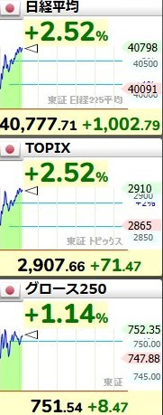 - 日本株は一時2.5%超上昇、日経平均の上げ幅1000円超