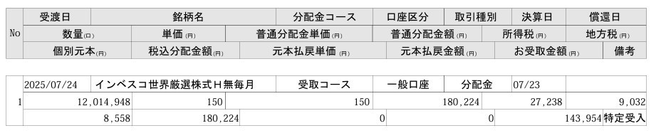 インベスコ 世界厳選株式オープン<為替ヘッジなし>(毎月決算型)ちゃん、配当150円 by wataridori · 2025年7月24日 普通分配さいこーっス! アライアンスバーンスタインは所得税が半額になってたのに、インベスコは毎月変わんない額を税金引かれるな。 よーわからん。 まあ、とにかく毎月、分配金は最高! 不労所得で呑む酒は旨いぜ!