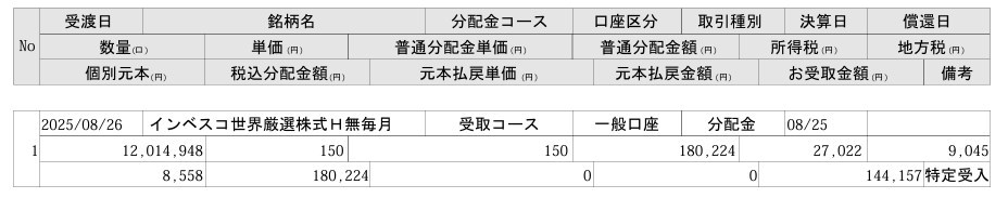 インベスコ 世界厳選株式オープン<為替ヘッジなし>(毎月決算型)ちゃん、配当150円 by wataridori · 2025年8月26日 今月もありがて~~~~~!!!! 今月も不労所得サンクス! 最高だぜ! もうベス子ちゃんには感謝感激雨あられw