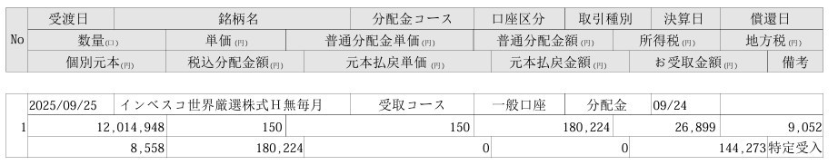 インベスコ 世界厳選株式オープン<為替ヘッジなし>(毎月決算型)ちゃん、配当150円 by wataridori · 2025年9月25日 今月も普通分配でありがてぇ! お金に働いてもらうとか最高では? 不労所得最高! ただ酒が今日も旨いぜ!