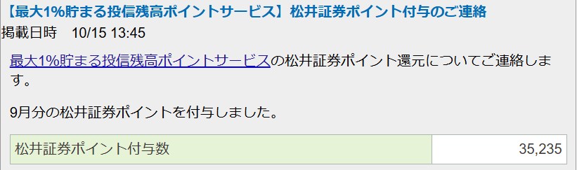 10月分の松井証券「投信残高ポイントサービス」が適用されました。 by wataridori · 公開済み 2025年10月15日 · 更新済み 2025年10月21日 今月もそのまま投信へ自動振替 今月も安定的にポイント還元。 松井証券のポイントみるとちまちまポイ活なんてやってらんねーな。