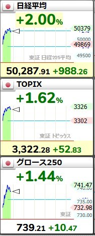 午前9時4分時点でTOPIXは前週末比1.3%高の3311.47、日経平均は1.5%高の5万0058円94銭と初めて5万円の大台に乗せた。