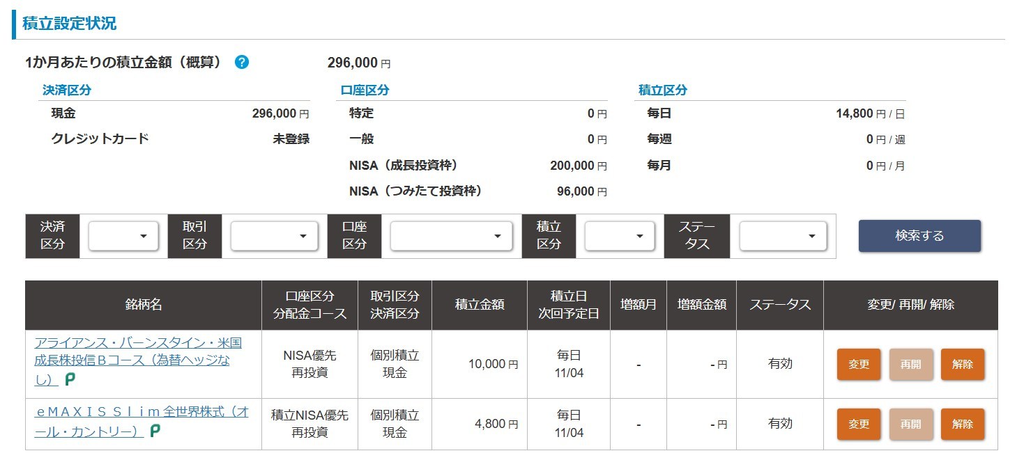 銘柄に関しては前回の設定をそのまま引き継いで、アライアンス・バーンスタイン・米国成長株投信Bコース(為替ヘッジなし)とeMAXIS Slim 全世界株式(オール・カントリー)のまま。