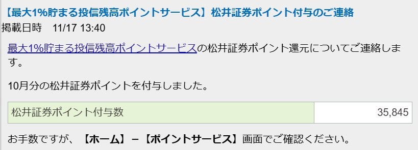 11月分の松井証券「投信残高ポイントサービス」が適用されました。 by wataridori · 2025年11月18日 今月も使い道はないので再投資 なんだかんだポイ活だけで時価100万超えてるんだから積み立て投資ってすごいね! 松井証券さんさまさまやで!