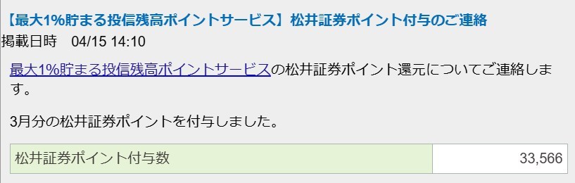 4月分の松井証券「投信残高ポイントサービス」アザース! by wataridori · 公開済み 2026年4月15日 · 更新済み 2026年4月16日 今月も助かるわ~ しかし、松井ポイントで先進国インデックス毎月自動購入してるけどいつのまにか評価額130万円ちかいのは草ですな。 マジでポイ活さまさまやで~~。 ぐへへ、元手タダやしね~❤