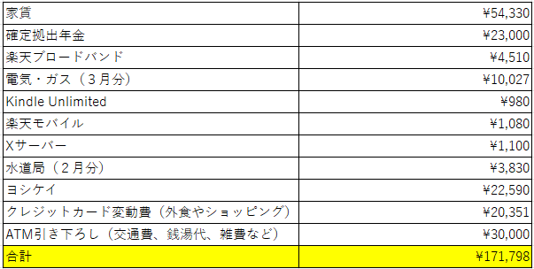 特に細かく集計していないけど、酒代・土日食費・交通費・銭湯代そのた生活雑費で毎月5万