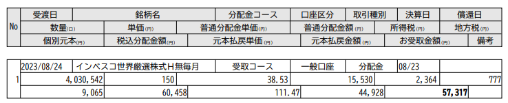 インベスコ 世界厳選株式オープン<為替ヘッジなし>(毎月決算型)ちゃん、配当150円サンキュー by wataridori · 2023年8月24日 でも一部元本払い戻しなのいやん 一部元本払い戻しのためインベスコの個別元本も ¥9,065 → ¥8,945に下がってる。 まあ、しゃーなし。 来月に期待!