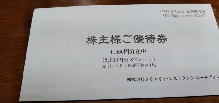0 国内株式 / 株主優待 2024年11月14日 by wataridori · Published 2024年11月14日 · Last modified 2024年11月17日 クリエイトレストランツホールディングスより株主優待券到着! 4000円分の食事券ありがてー! しかし前回分もまだ使ってないんだよ...