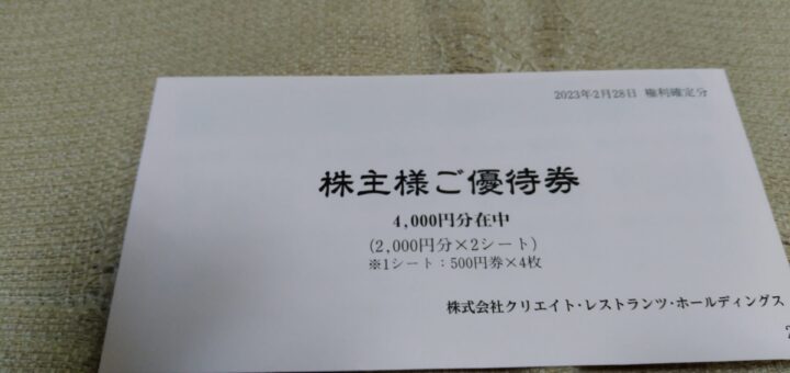 0 国内株式 / 株主優待 2023年11月13日 by wataridori · Published 2023年11月13日 クリエイトレストランツホールディングスより株主優待券到着! よし!吞みに行こう! 近所に4件ぐらいあったのにコロナで3件近く潰れ...